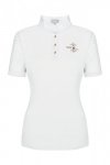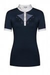Elegancki, dobrze dopasowany frak konkursowy z cienkiego, elastycznego, wodoodpornego softshellu. Kołnierzyk i aplikacja na plecach ozdobione dżetami w kolorze fraka.